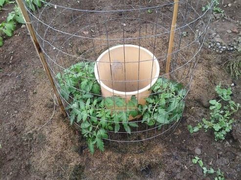 Four tomato plants are planted around the trash can, supported by a metal fence. Every 2 days, the trash can is filled with water.